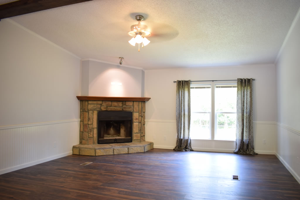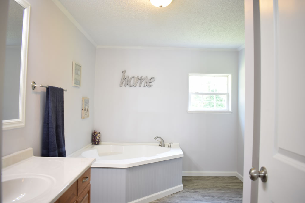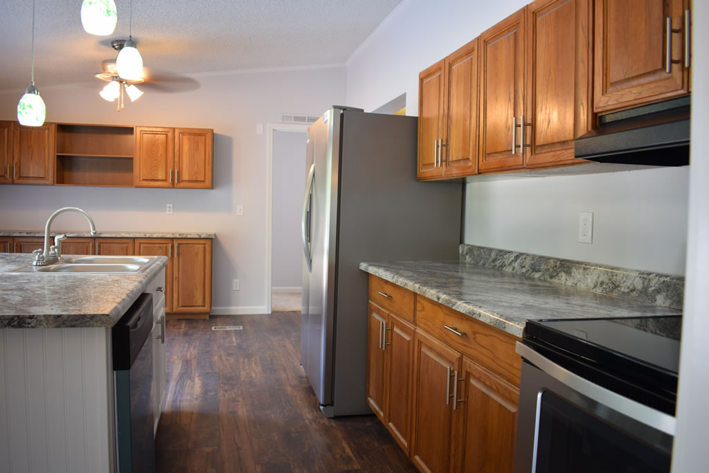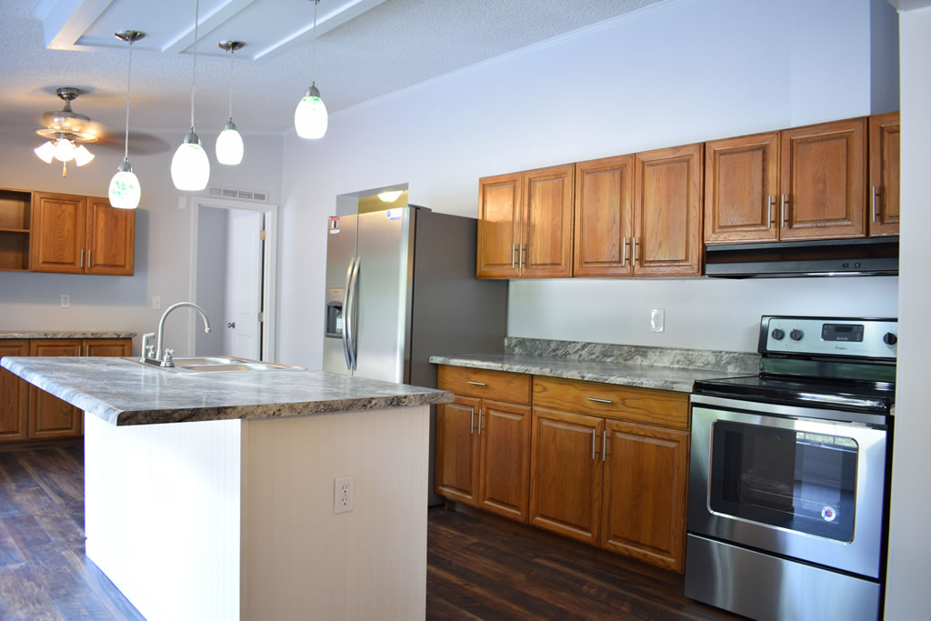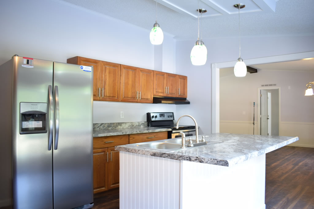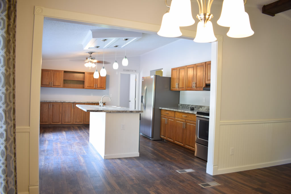 This double wide mobile home has undergone a stunning transformation, with a complete remodel that has transformed the space into a modern and comfortable home. By removing the joining strips, the walls now have a sleek and seamless appearance, giving the space a sense of continuity and flow. The kitchen has been updated with new appliances, countertops, and cabinets, creating a bright and inviting area perfect for cooking and entertaining. The flooring throughout the home has been replaced with new, high-quality materials that add warmth and texture to the space. New light fixtures have been installed, providing ample lighting and a fresh, modern look.